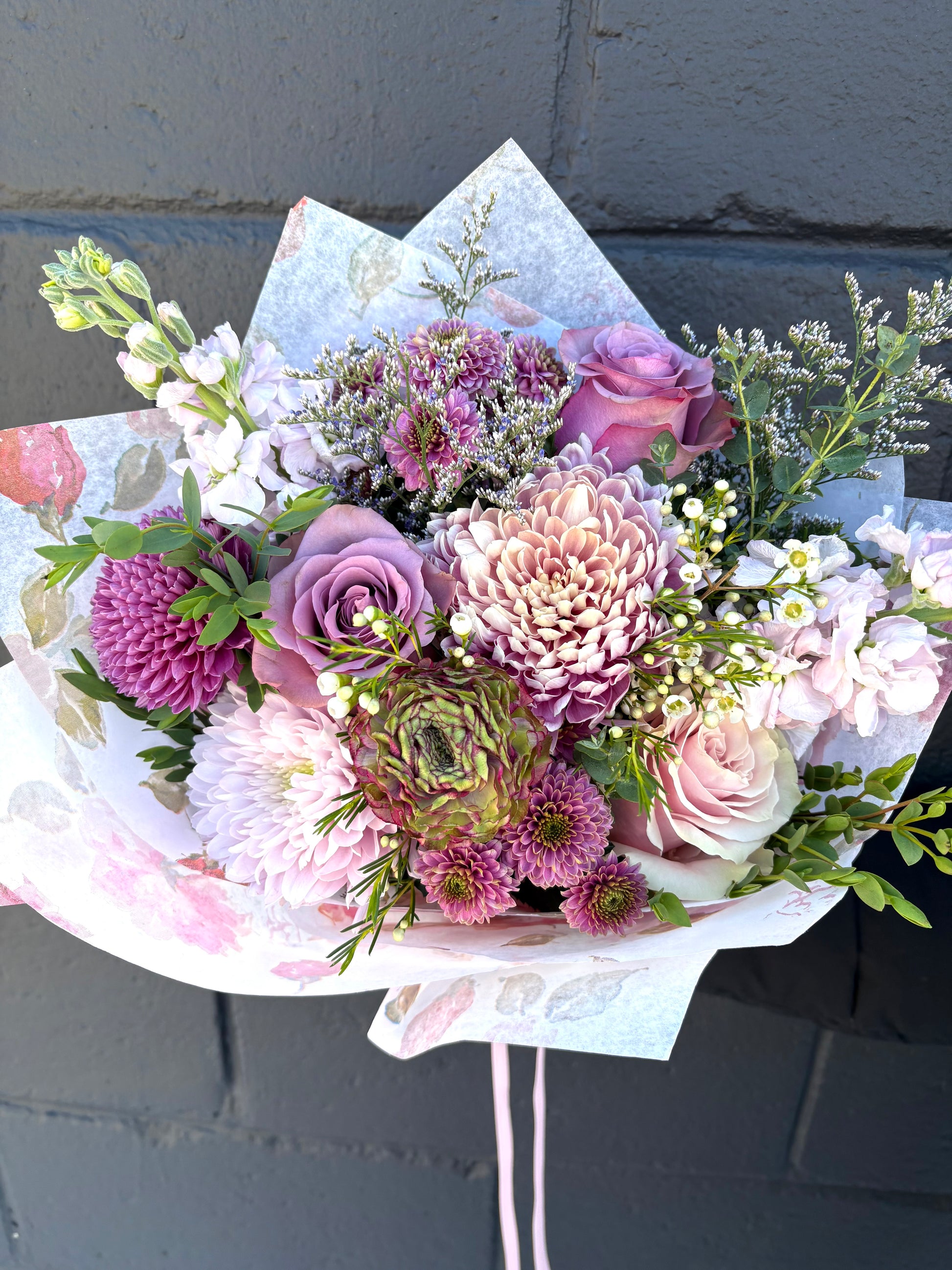 A romantic mixed-floral dream bouquet. Please note we have more shades of pinks creams, corals and purple flowers arriving for Valentine's Day! This is a sample bouquet. The bouquets will include roses, ranunculus, specialty chrysanthemums, waxflower and more.