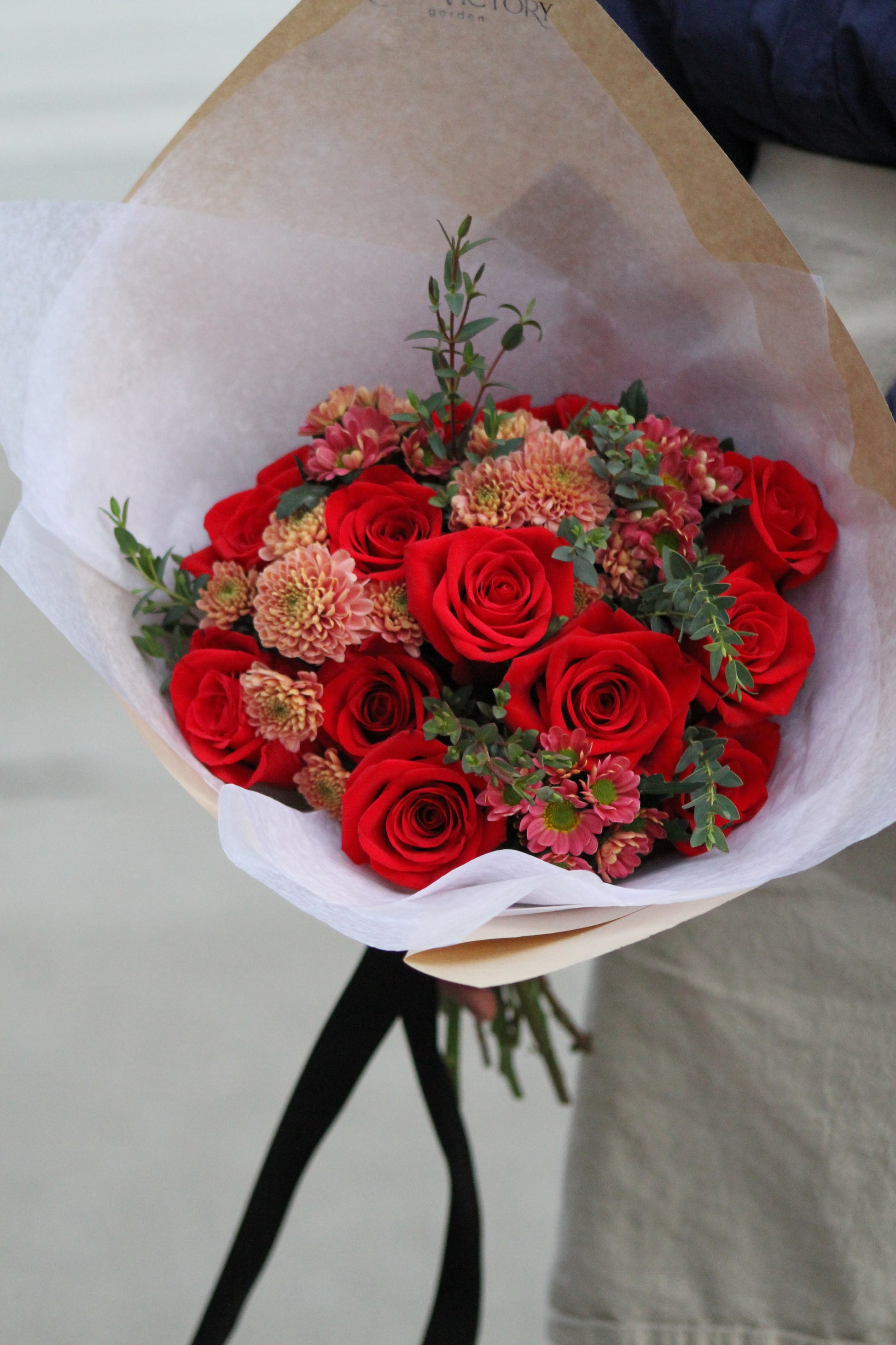 The most elegant arrangement of a full bouquet of premium red roses. Classy, stunning & filled with love.